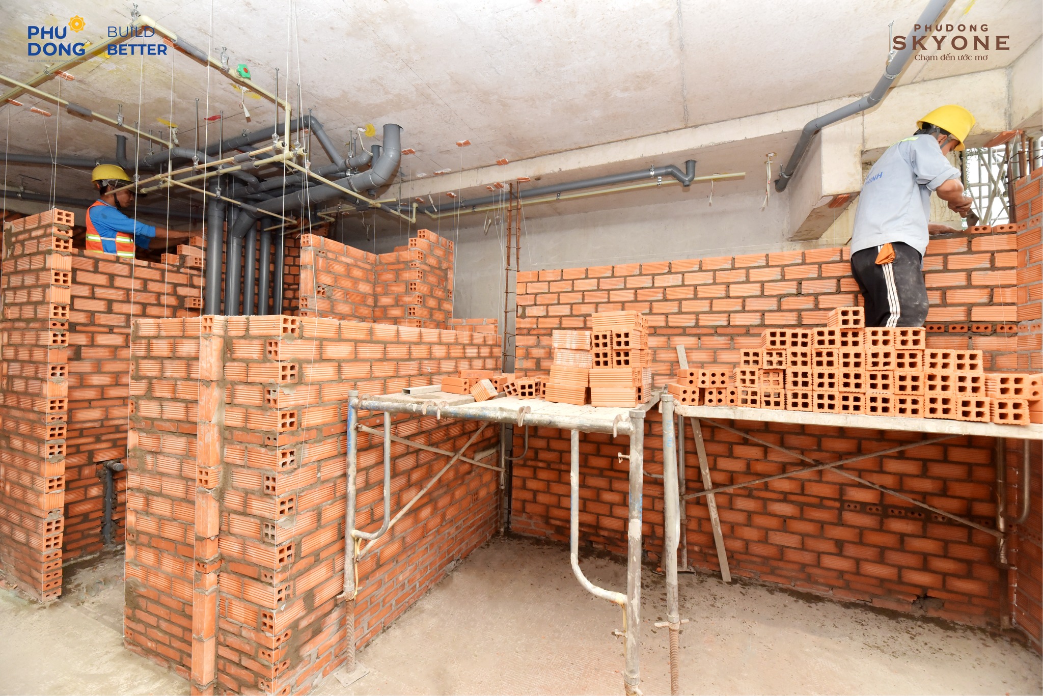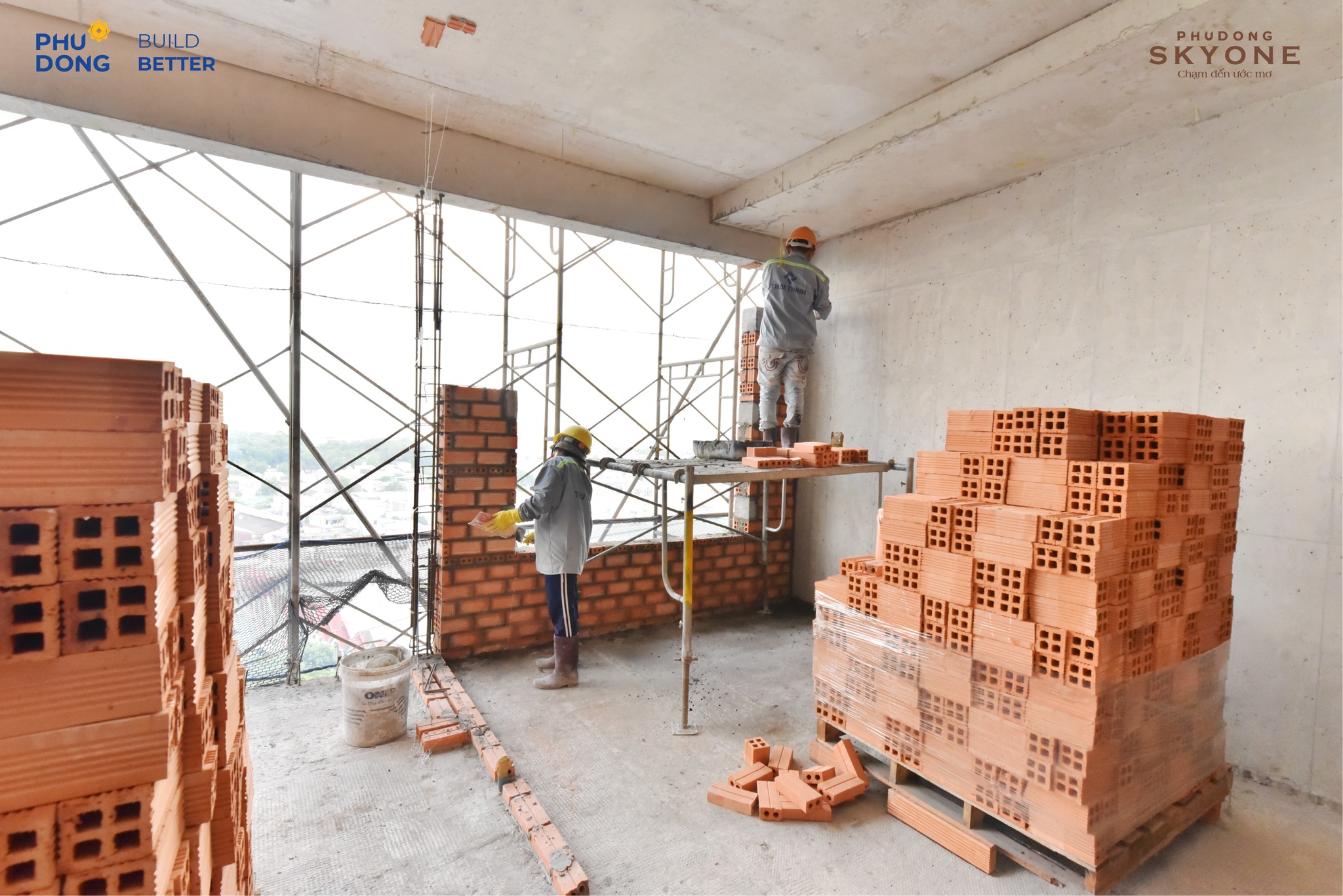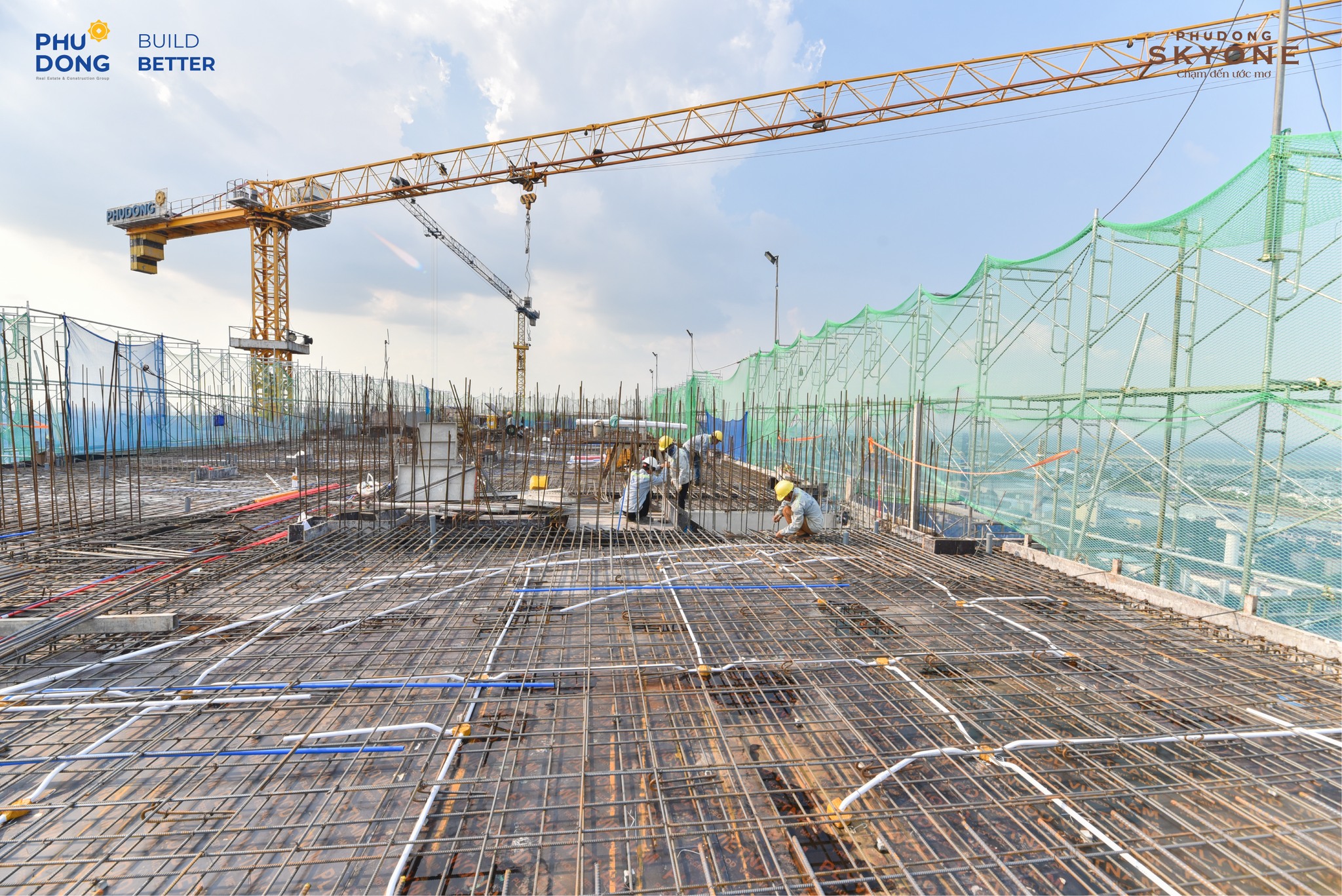 Công trình Phú Đông SkyOne hiện đang thi công đến tầng 26. Song song đó, các hạng mục như hồ nước cảnh quan và xây tường tại tầng 9A, 10B cũng đang được triển khai đồng bộ.